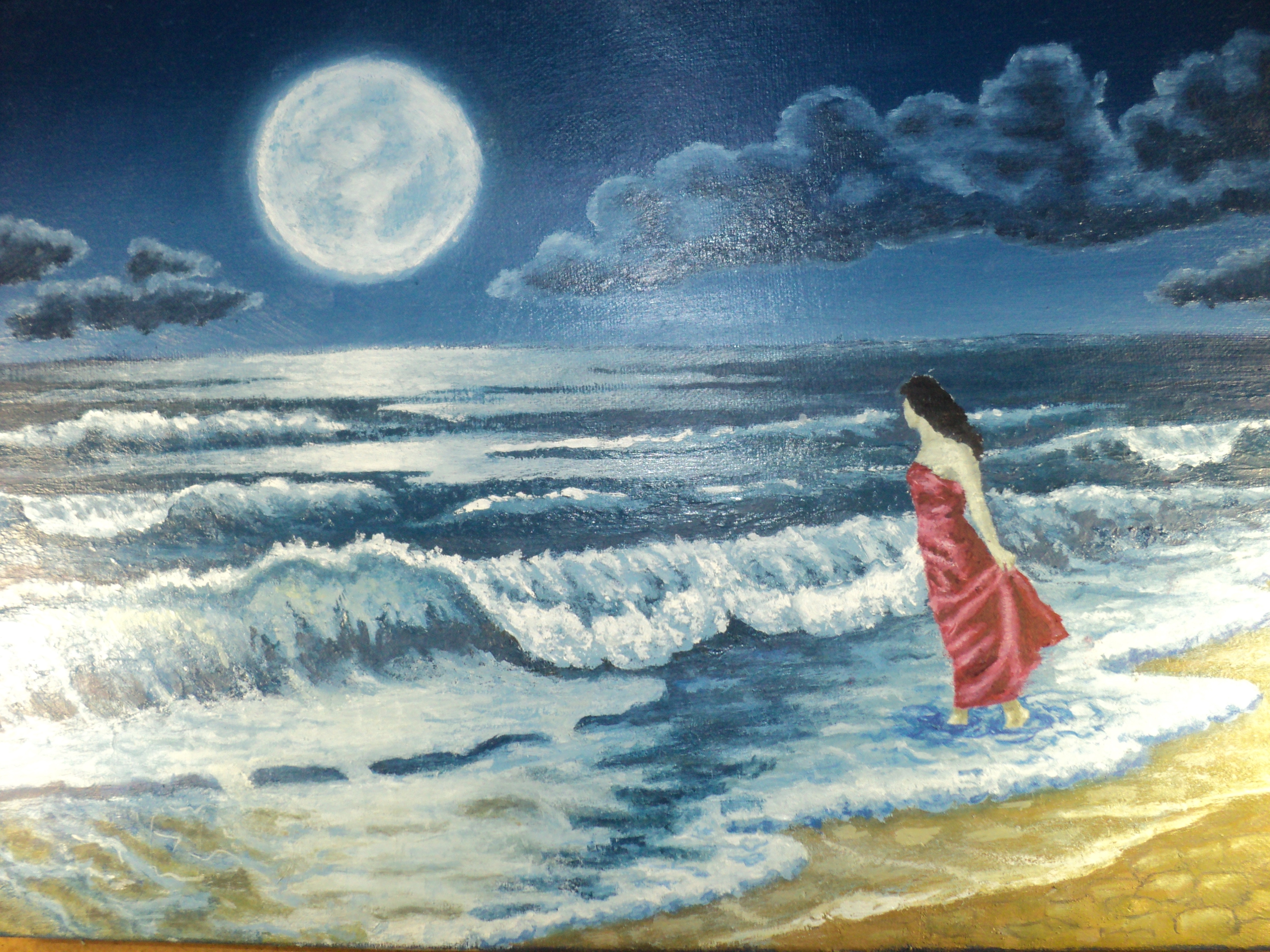 "Лунное притяжение" - это авторская картина масляными красками на холсте в багете изображает девушку, идущую по берегу волнующегося моря, смотрит на притягивающую её большую луну. Размеры: 60,5 см х 40 см (h). Картина без оформления в багет готова к немедленной продаже.