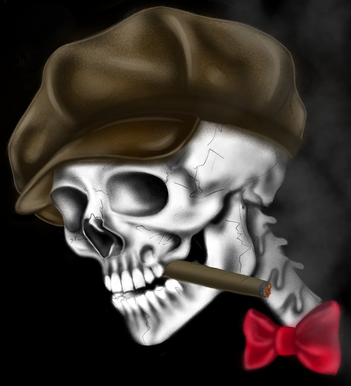 Skull-иллюстрация, импровизация. Череп на чёрном фоне в кепоне и с сигарой в зубах... Может пригодится для иллюстрации ваших задумок. Выполнен на планшете в программе "Ibispaint". Больше добавить нечего 😄