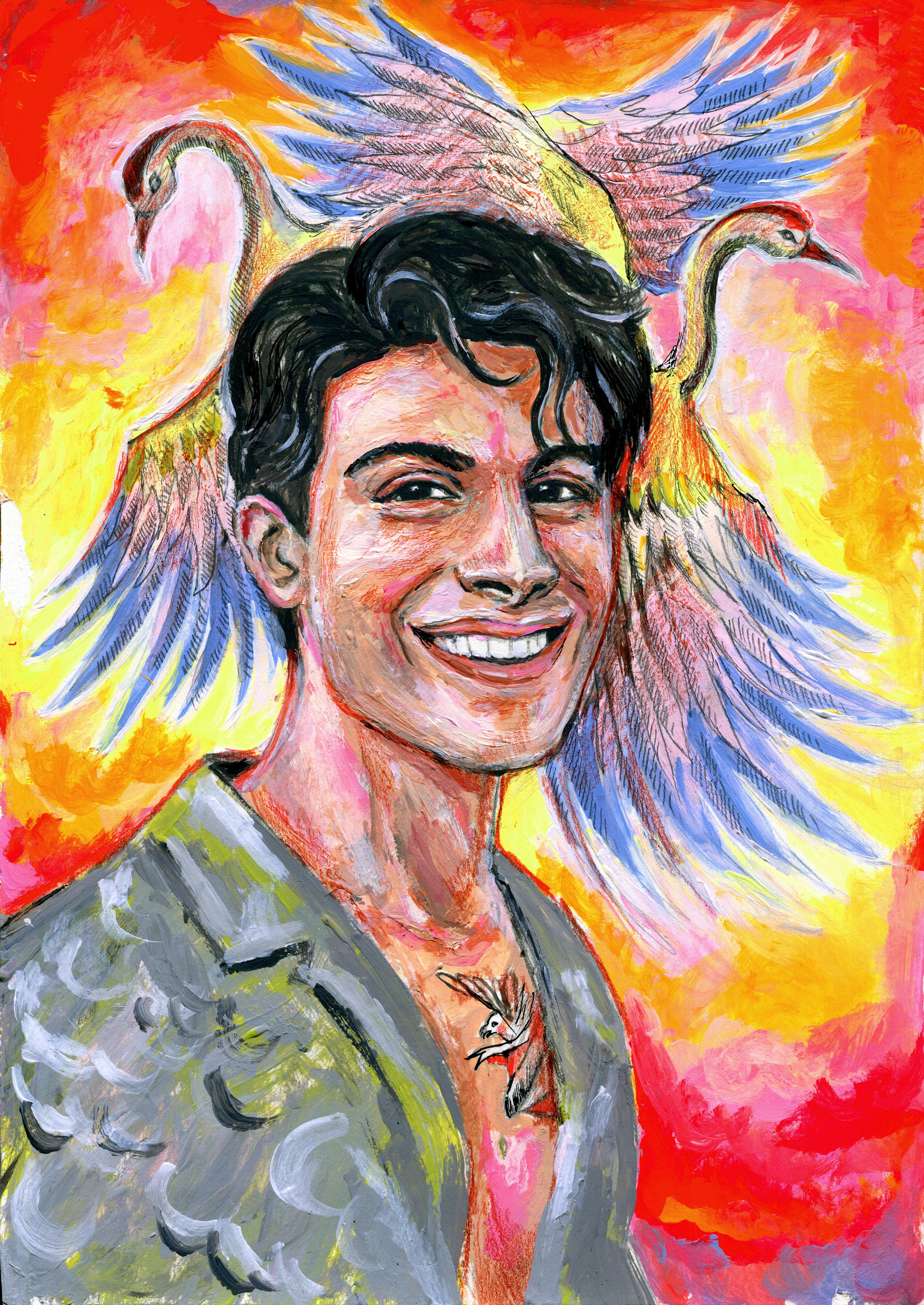 Портрет одного из моих любимых актеров из сериала Волчонок, Эндрю Матараццо. Его рубашка изначально была с принтом из птиц, но я решила поступить немного по другому, и сделать фон с птицами :)
