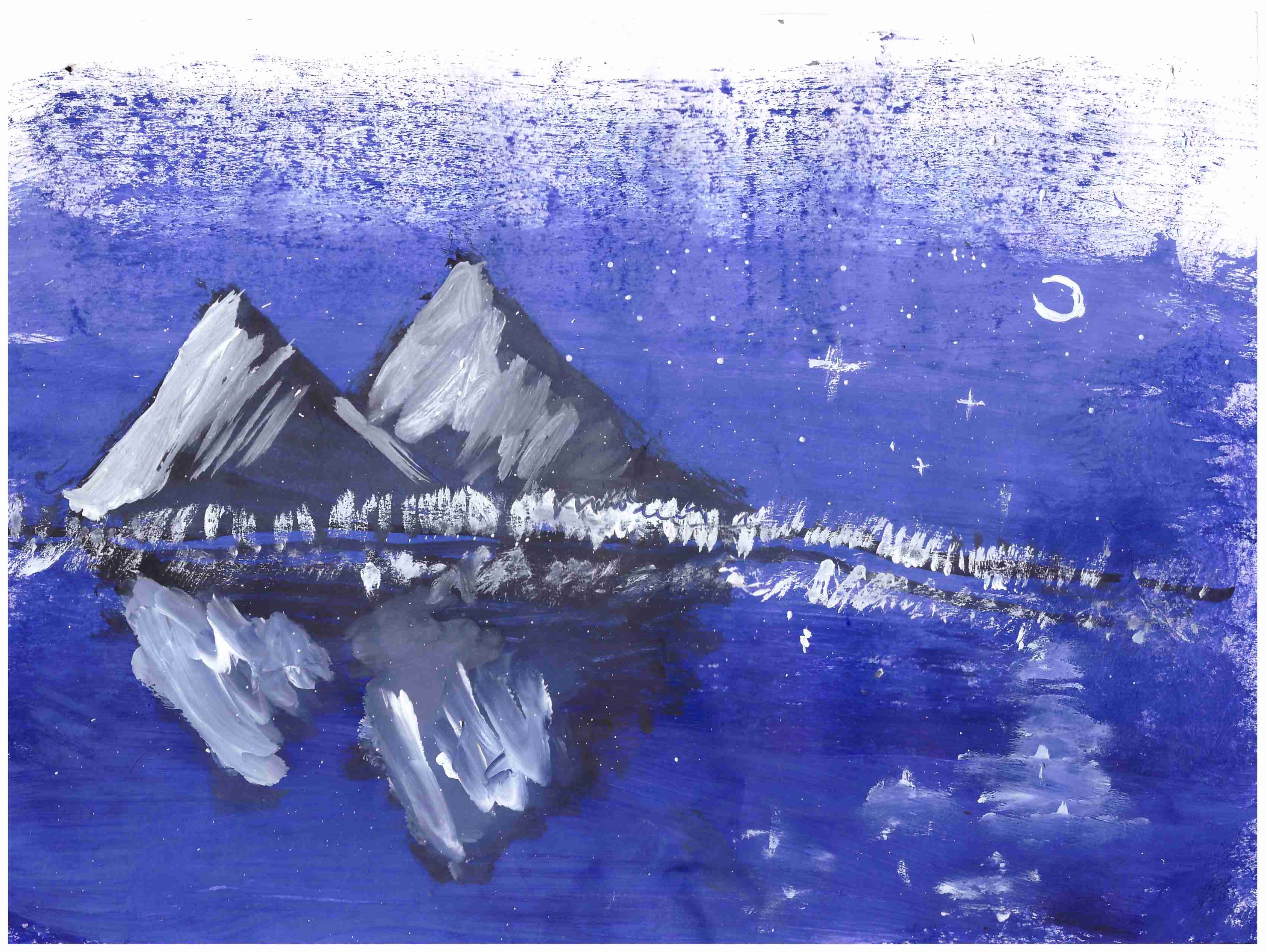 на этой картине- изображены горы ночью с отражением в воде и с белыми бликами. я трудилась над этой картиной, мне одиннадцать лет. оцените в комментариях.