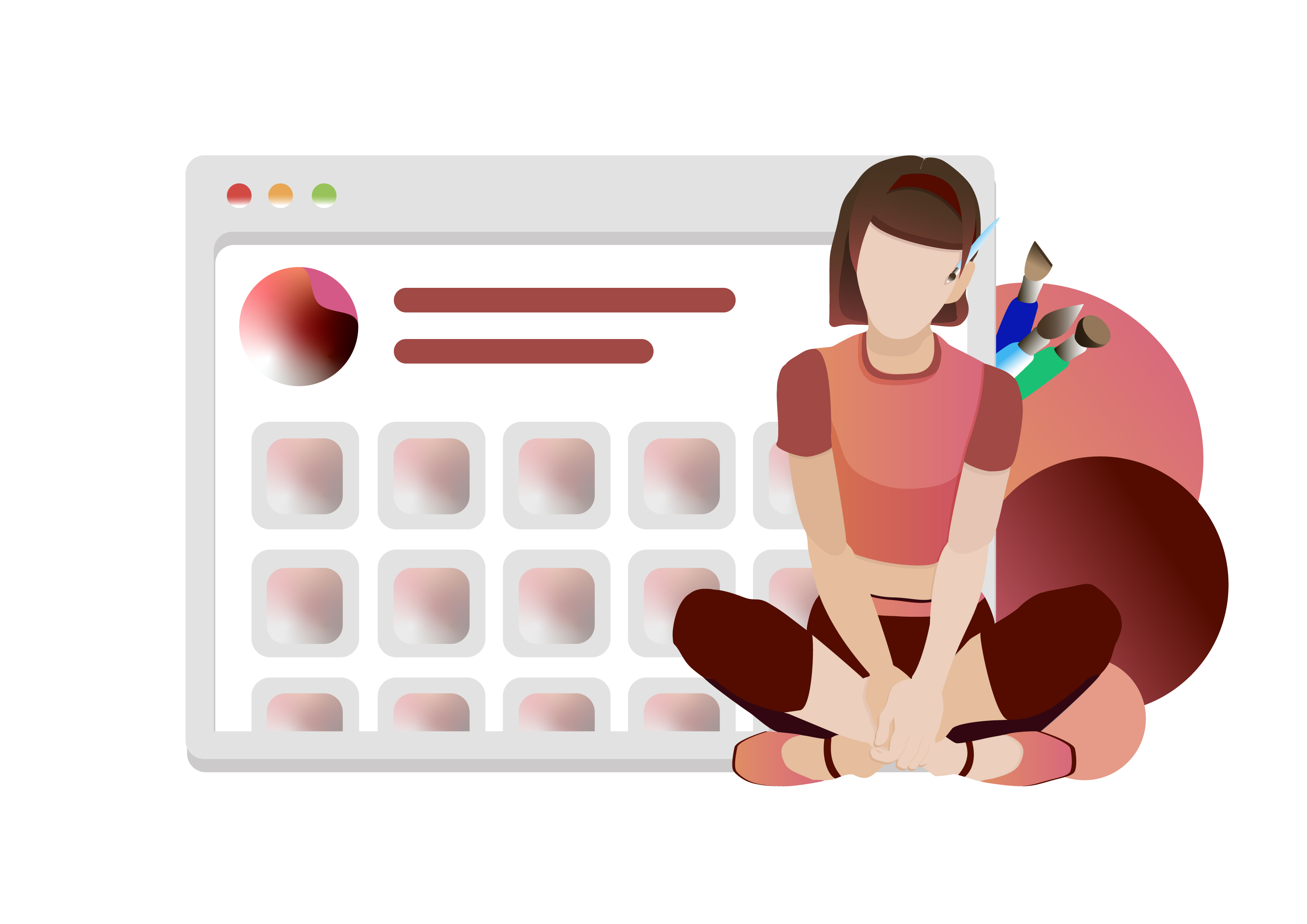 Современная девушка в красно-бордовых тонах на фоне творческого сайта. Арт может подойти в качестве фона для оформления сайта, рекламы или для типографских работ.