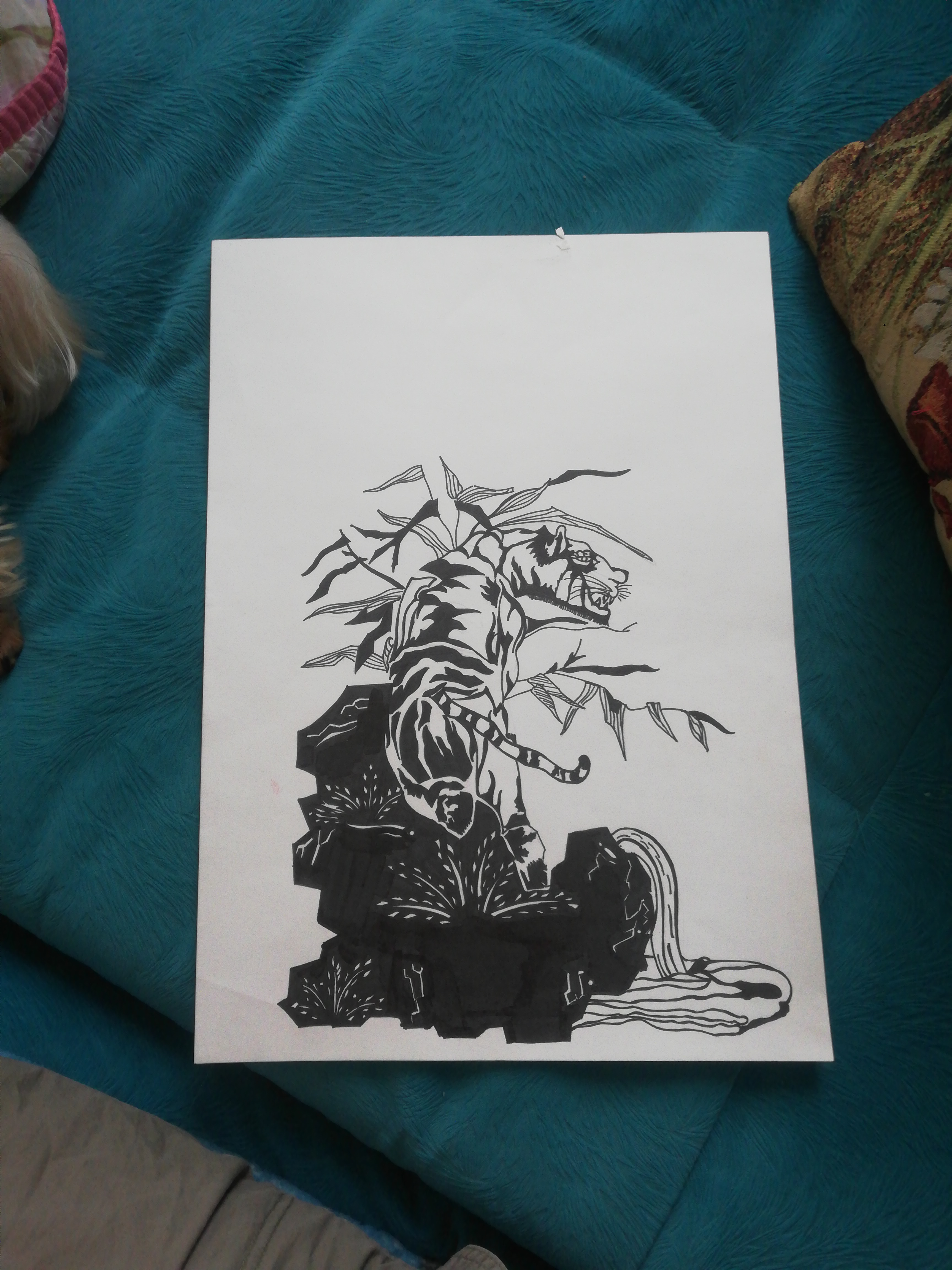 Работа сделана маркером на листе А3. На ней изображен тигр с линиями, который выполнены от руки. Вся работа сделана без помощи линиейки и других приспособлений