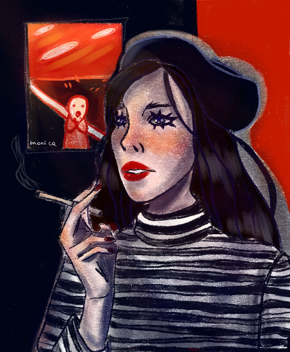 На картинке иллюстрировано курящую женщину.Сзади неё, висит на стене картина.Выполнено в красных и тёмно-синих тонах,предположительно она француженка.Текстурные кисти в работе приоритет.