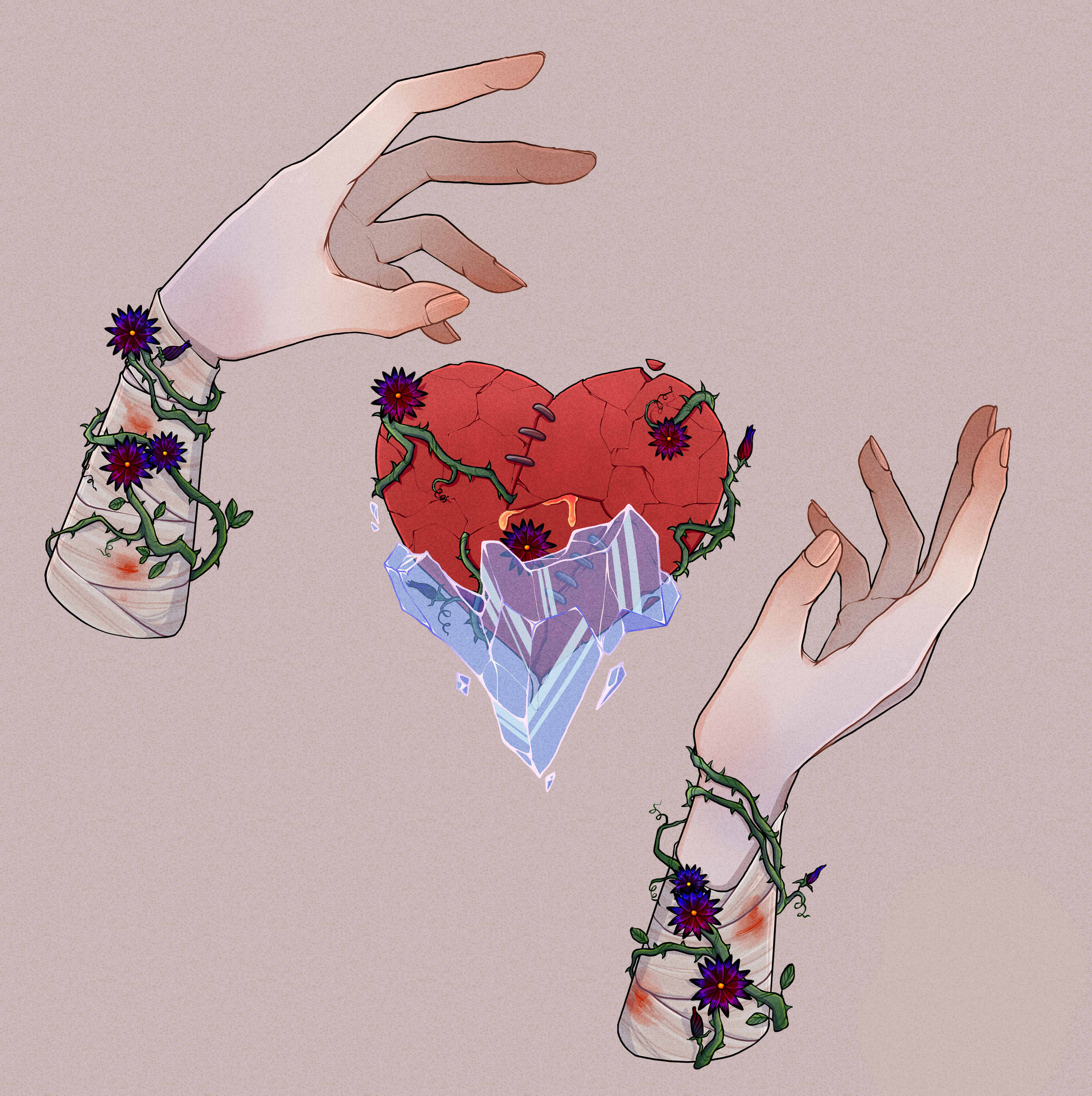 Иллюстрация, отображающая внутренние чувства человека, в данном случае, разбитое сердце, которое в порыве защиты обрастает колючим плющем и ледяной коркой. Данную картинку можно использовать как обложку для блокнота или тетради, как плакат или даже, возможно, как иллюстрацию в книге по психологии.