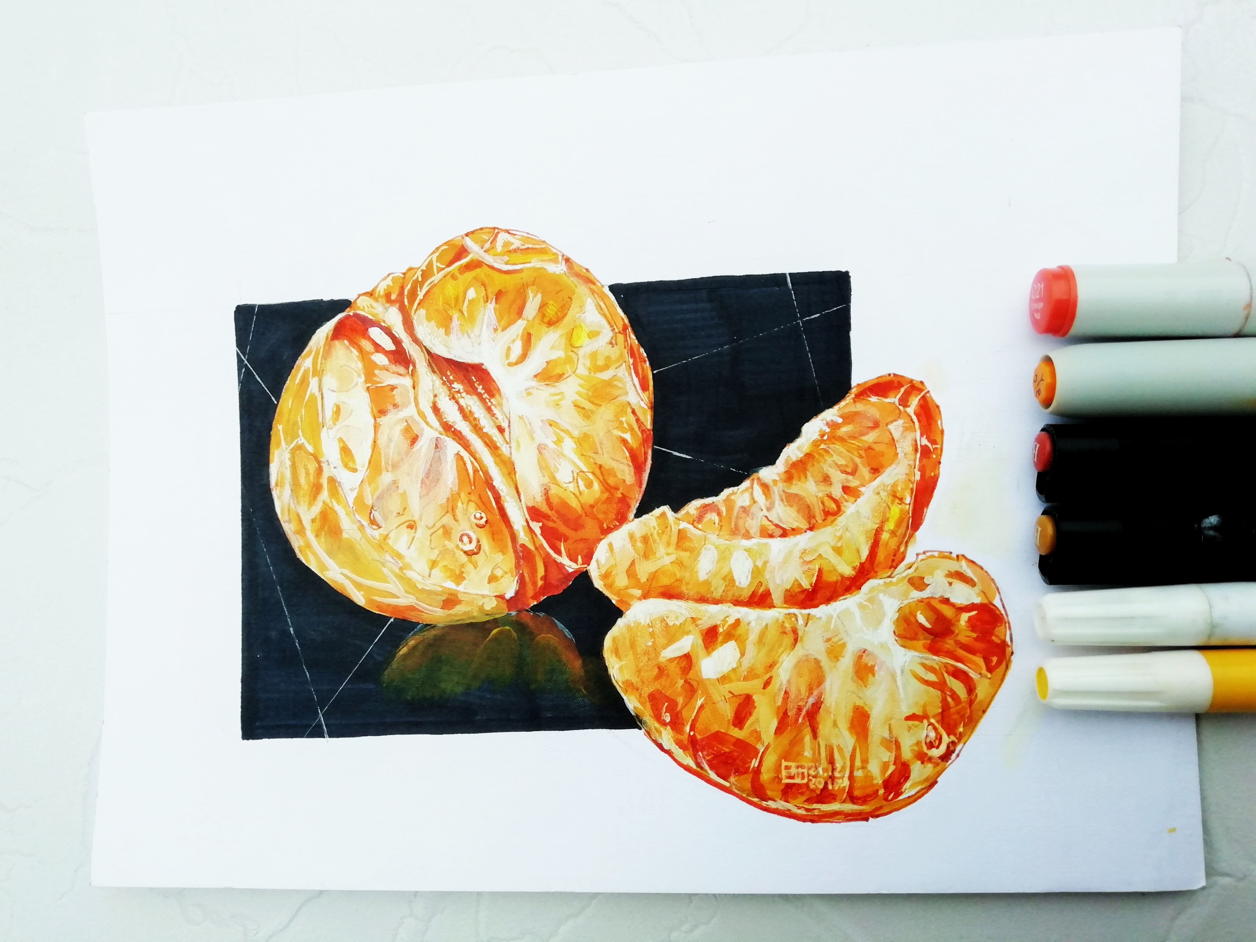 Материалы: спиртовые, пигментные и акриловые маркеры, белая ручка на листе плотного кардстока