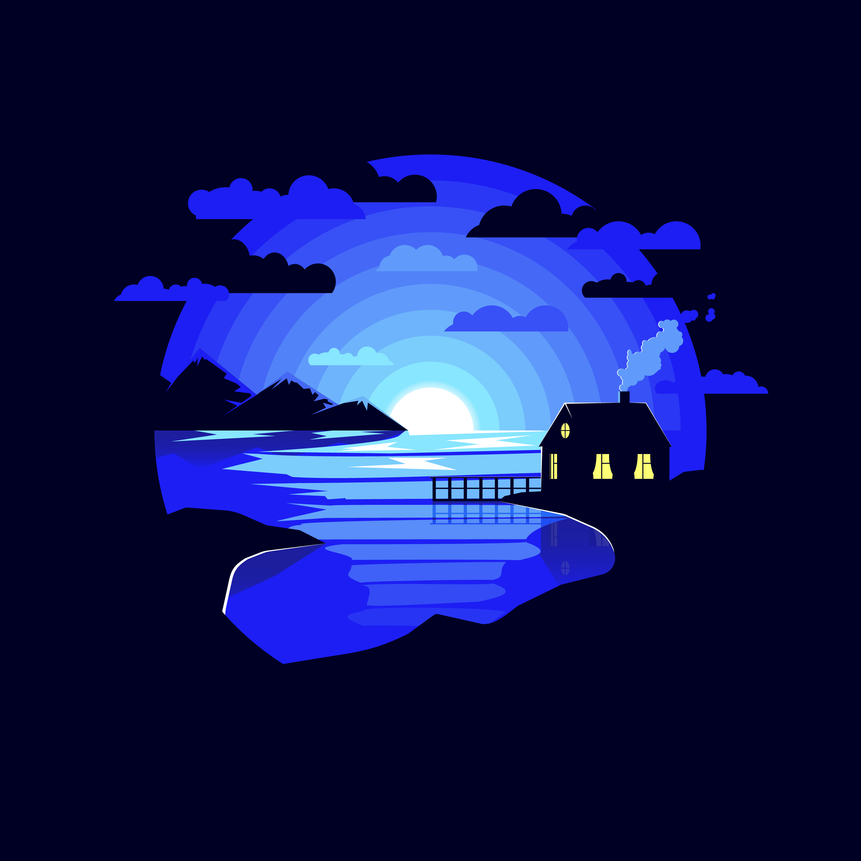 Уютным домик у озера, в котором живут люди и наслаждаются жизнью. Небольшой мостик ведет к воде, в которой семья любит плавать теплыми, летними вечерами.