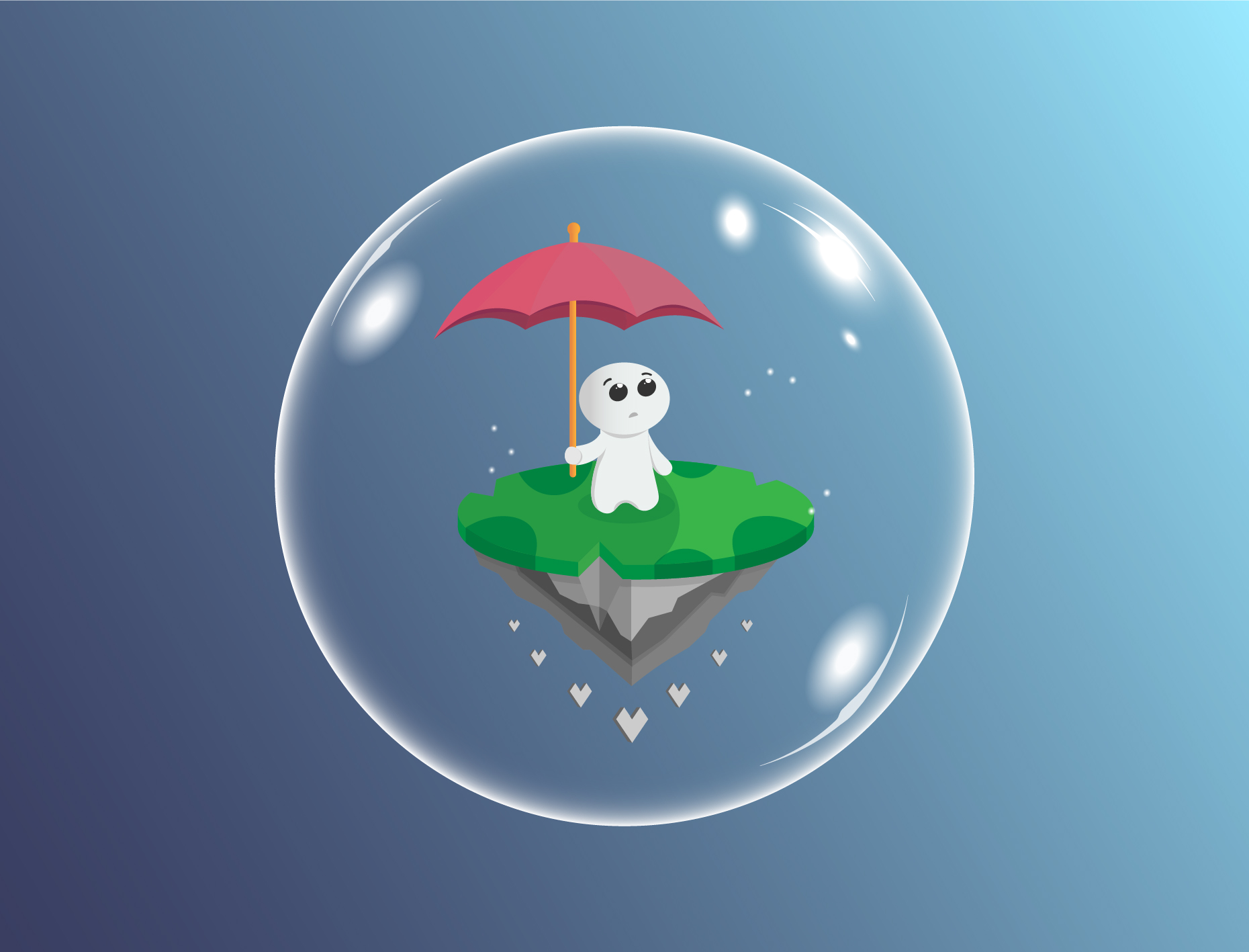 Работа выполнена в "Adobe illustrator". Мальчик в пузыре на островке. .